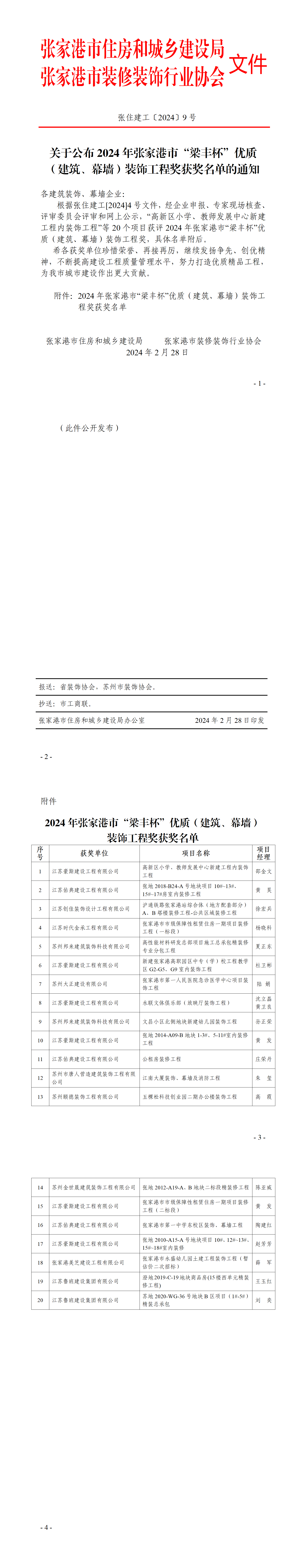 关于公布2024年张家港市“梁丰杯”优质 (建筑、幕墙)装饰工程奖获奖名单的通知